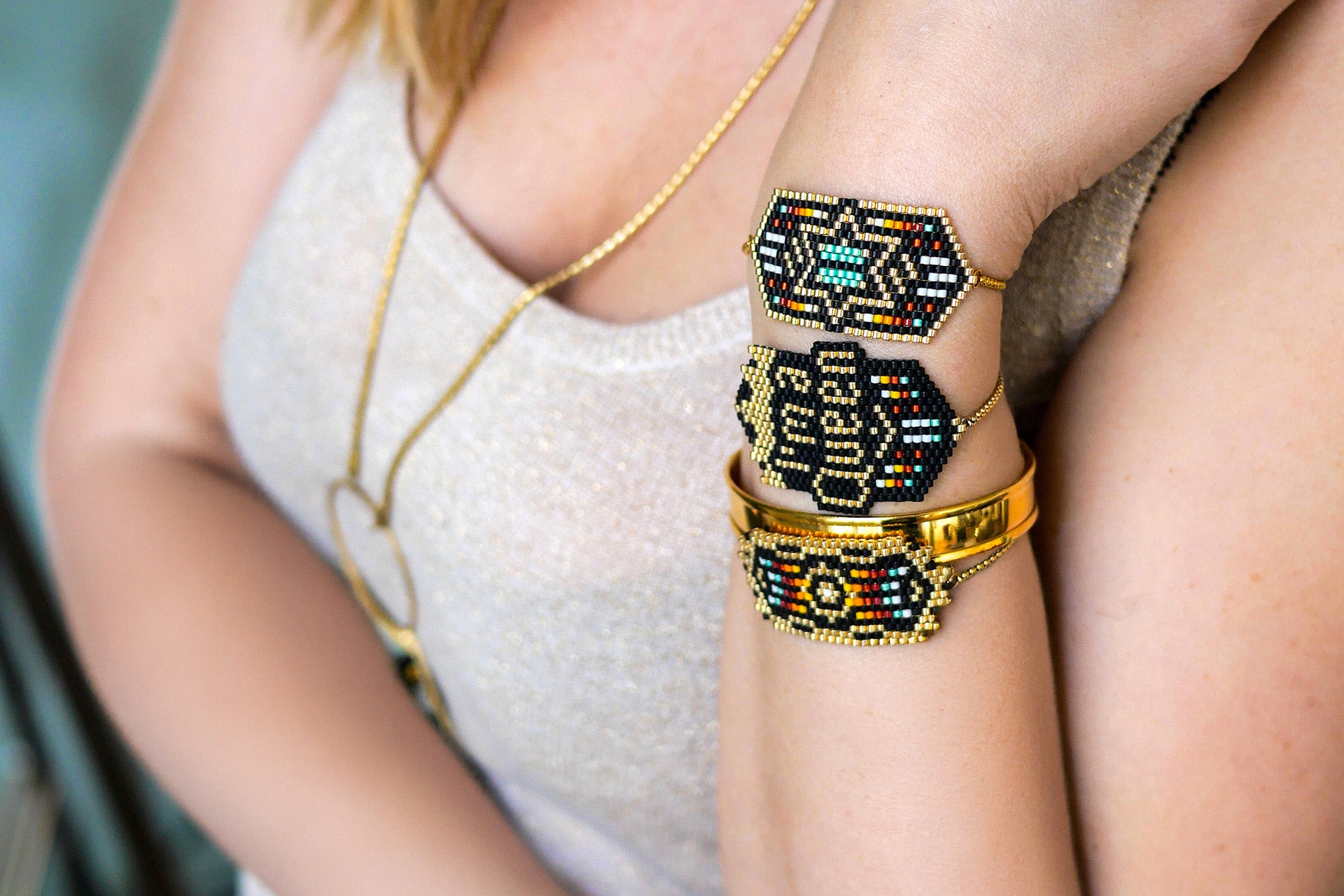 Technique du tissage façon Brickstitch, qui consiste à enfiler les perles une par une solidement.