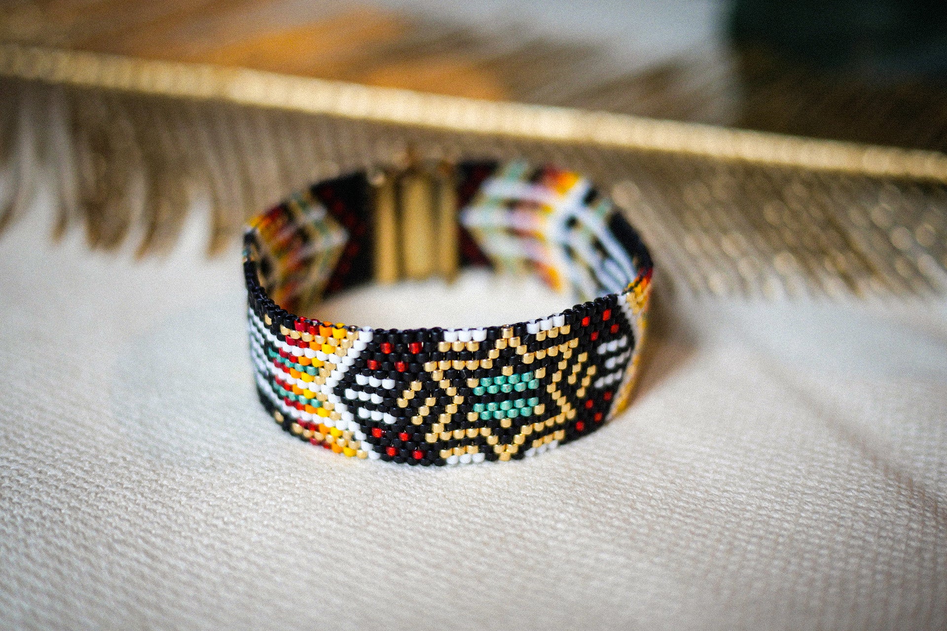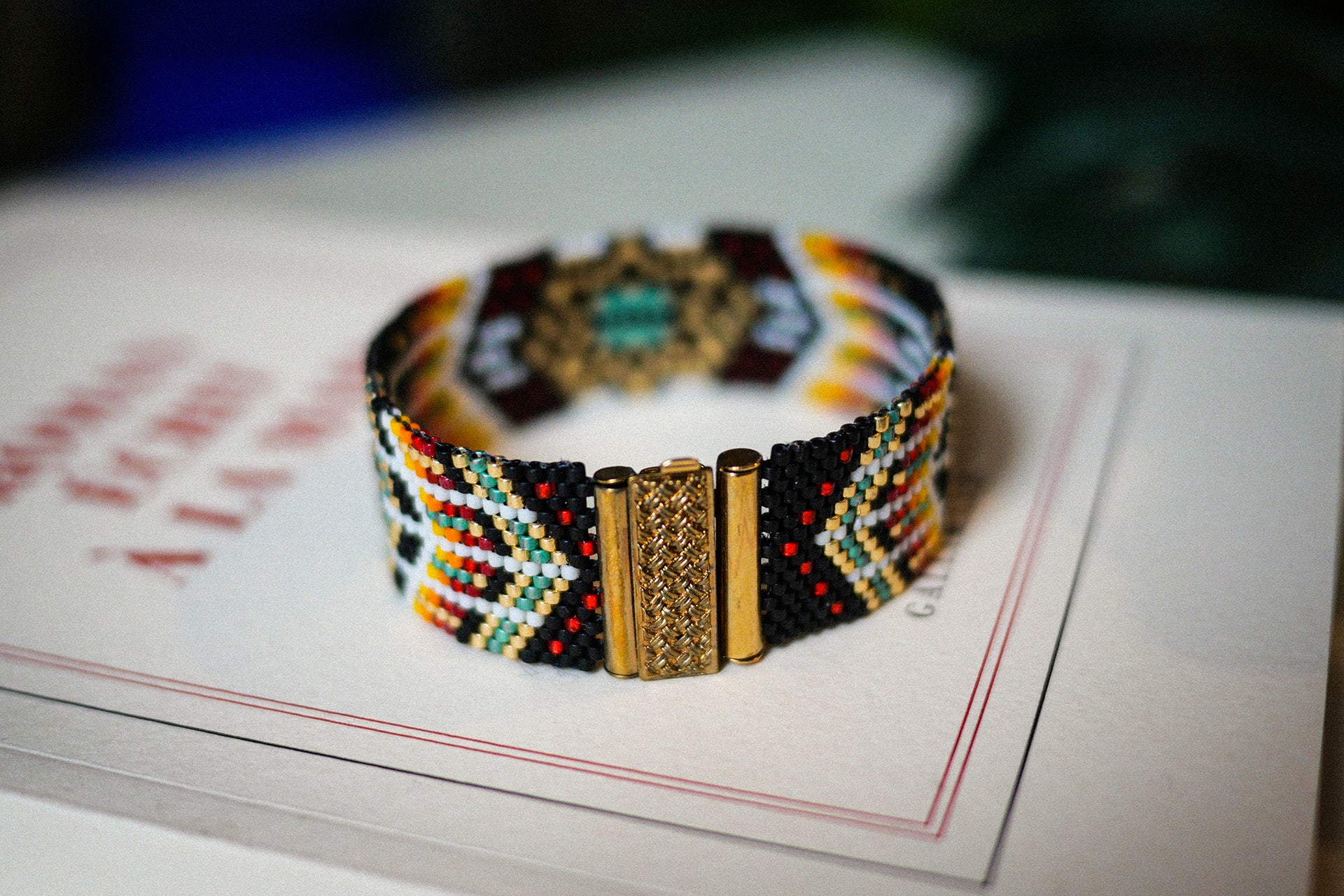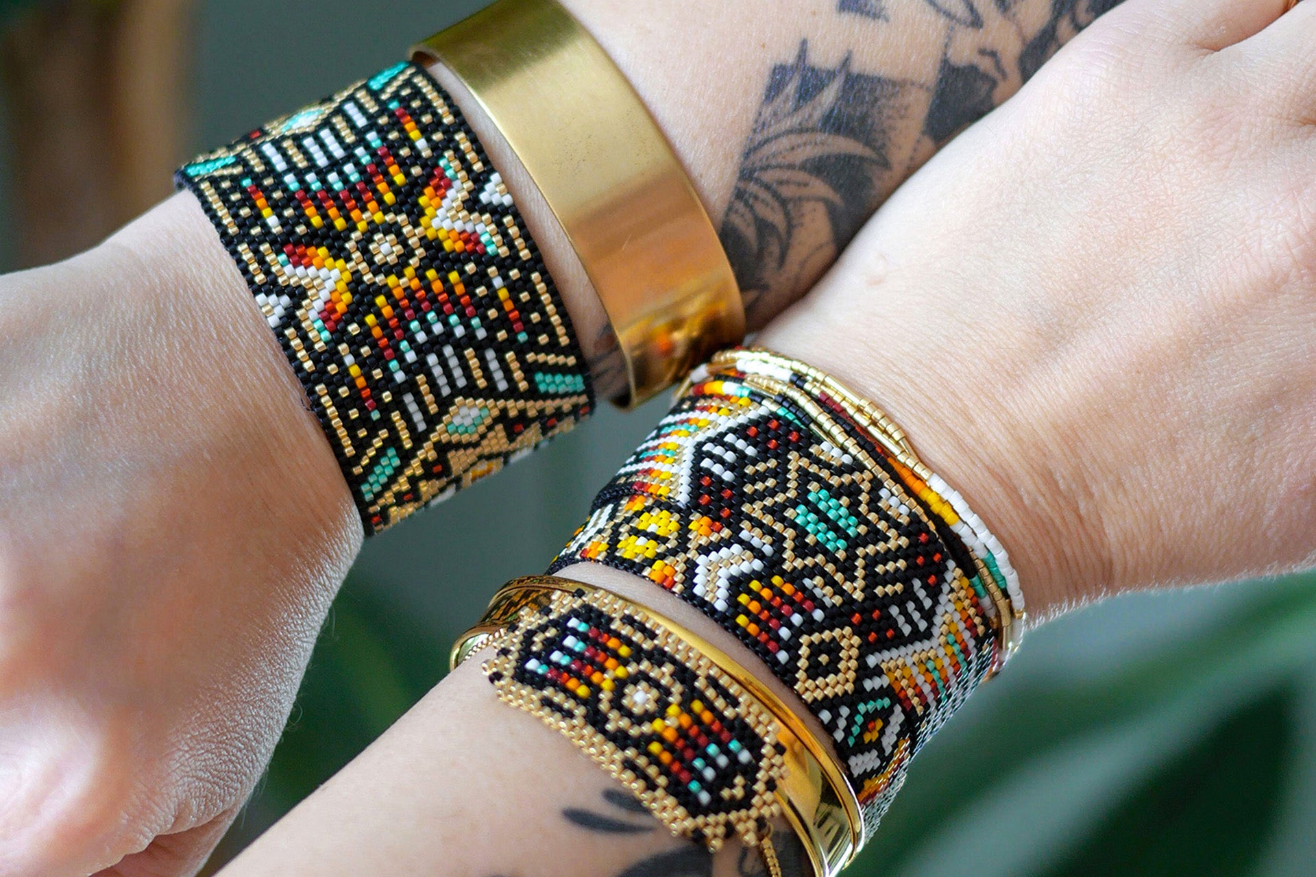 Technique du tissage façon Peyote, qui consiste à enfiler les perles une par une solidement. Cette technique complexe donne un rendu plus résistant, qualitatif et élégant.