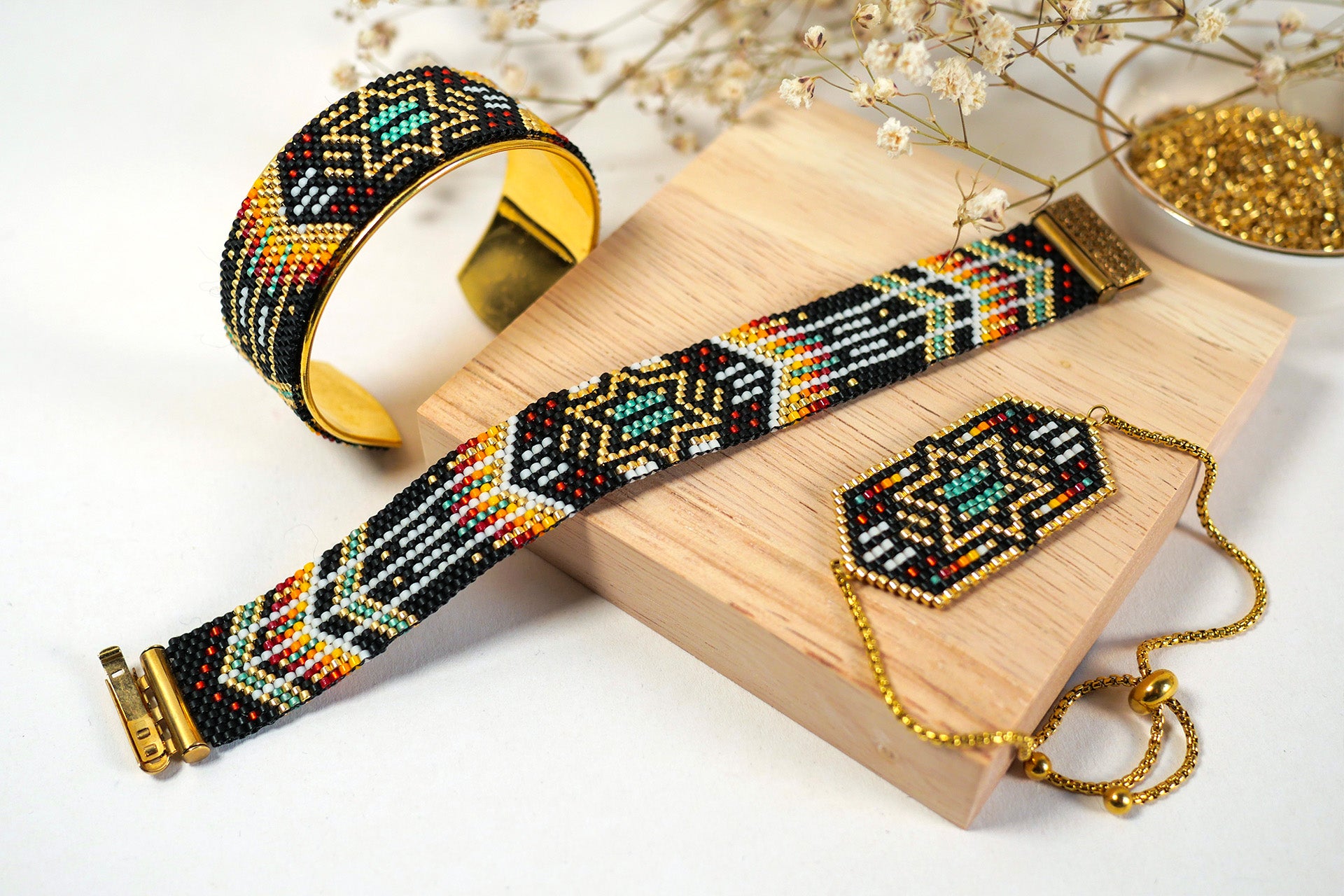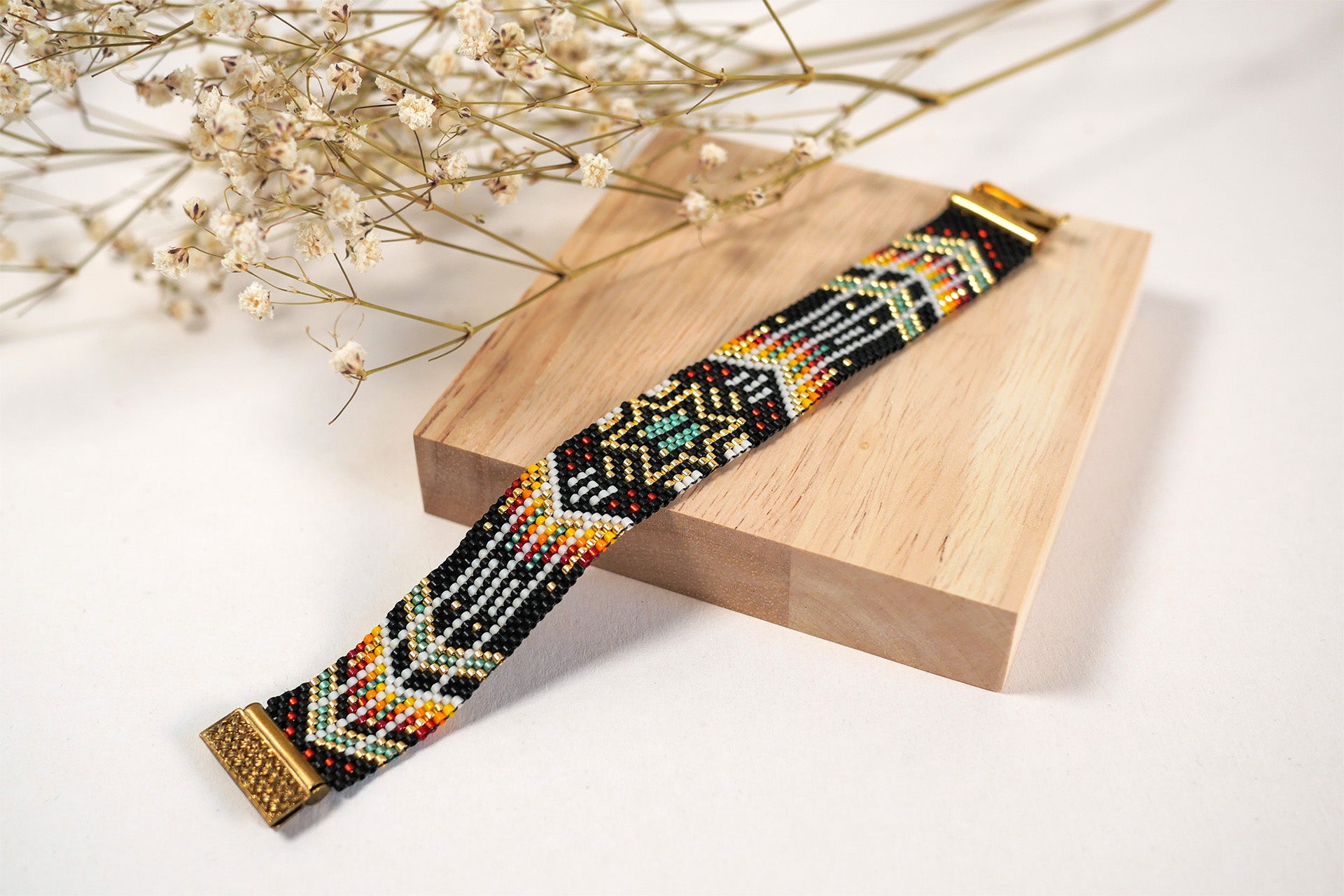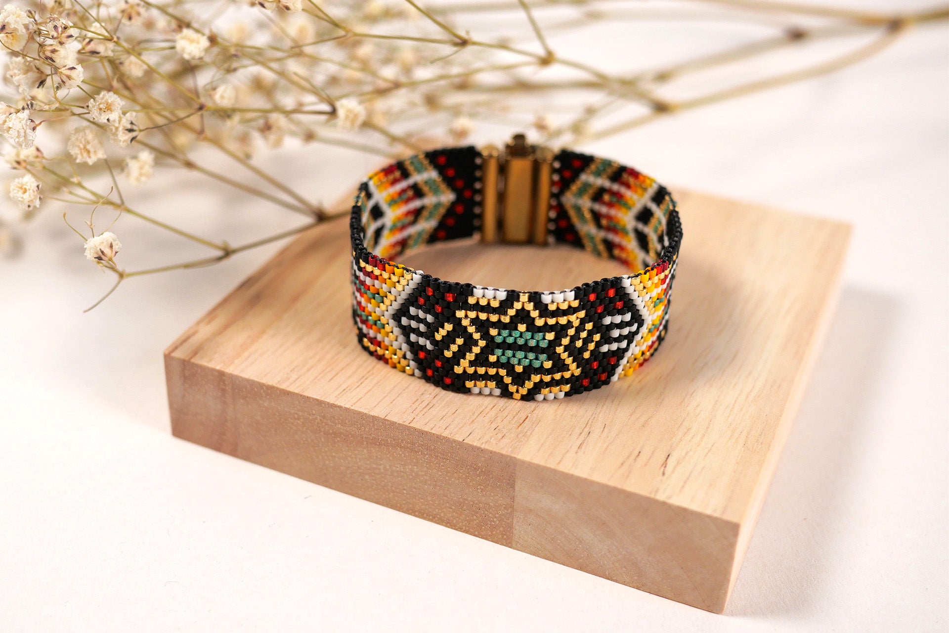 Technique du tissage façon Peyote, qui consiste à enfiler les perles une par une solidement. Cette technique complexe donne un rendu plus résistant, qualitatif et élégant.