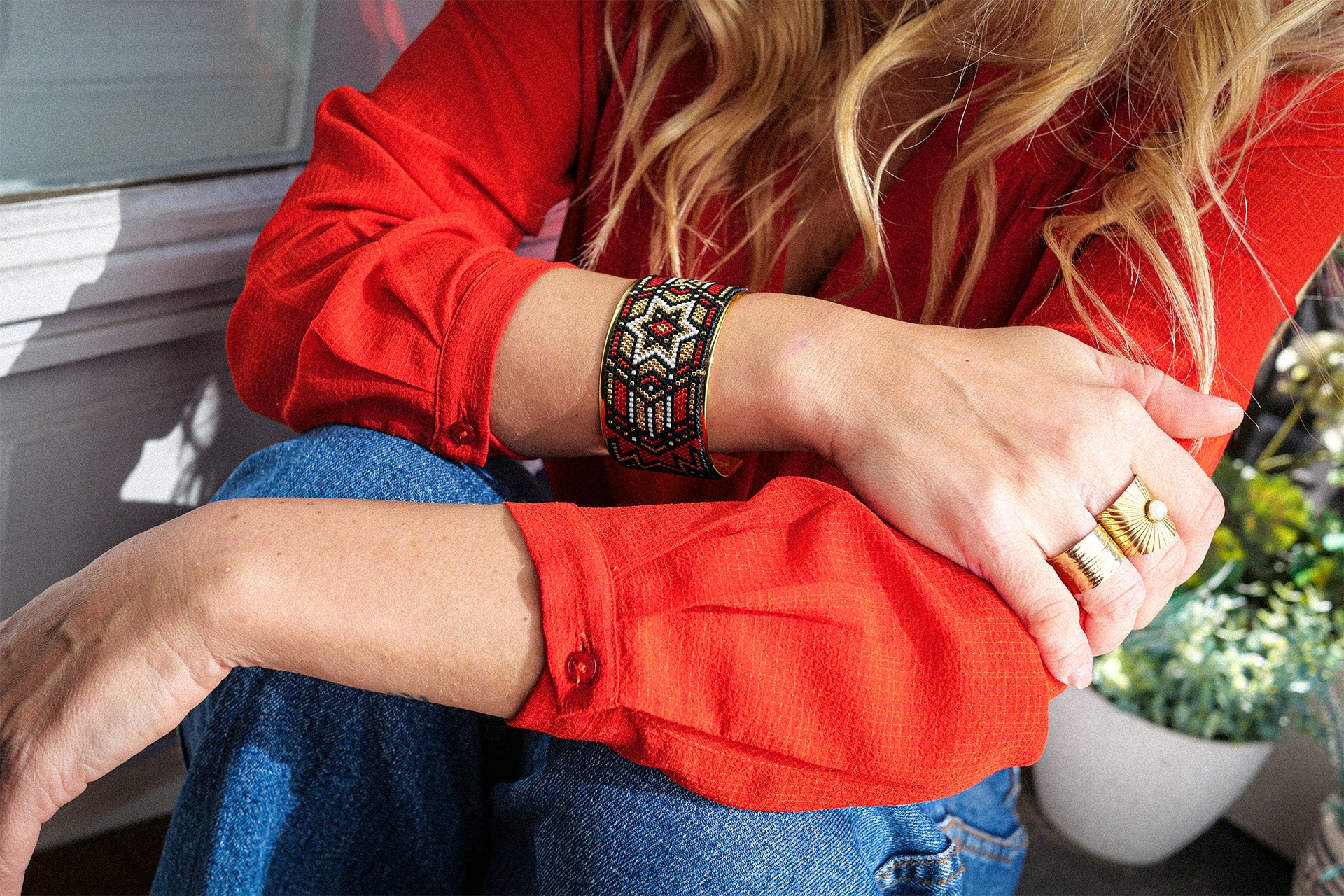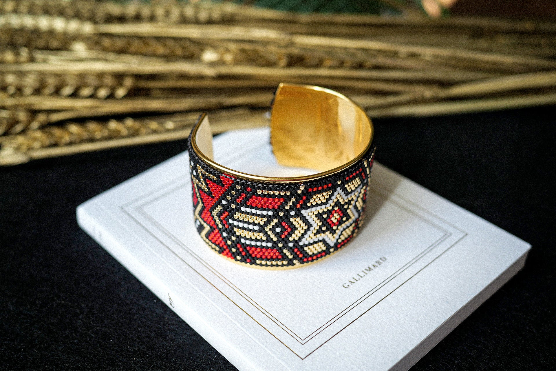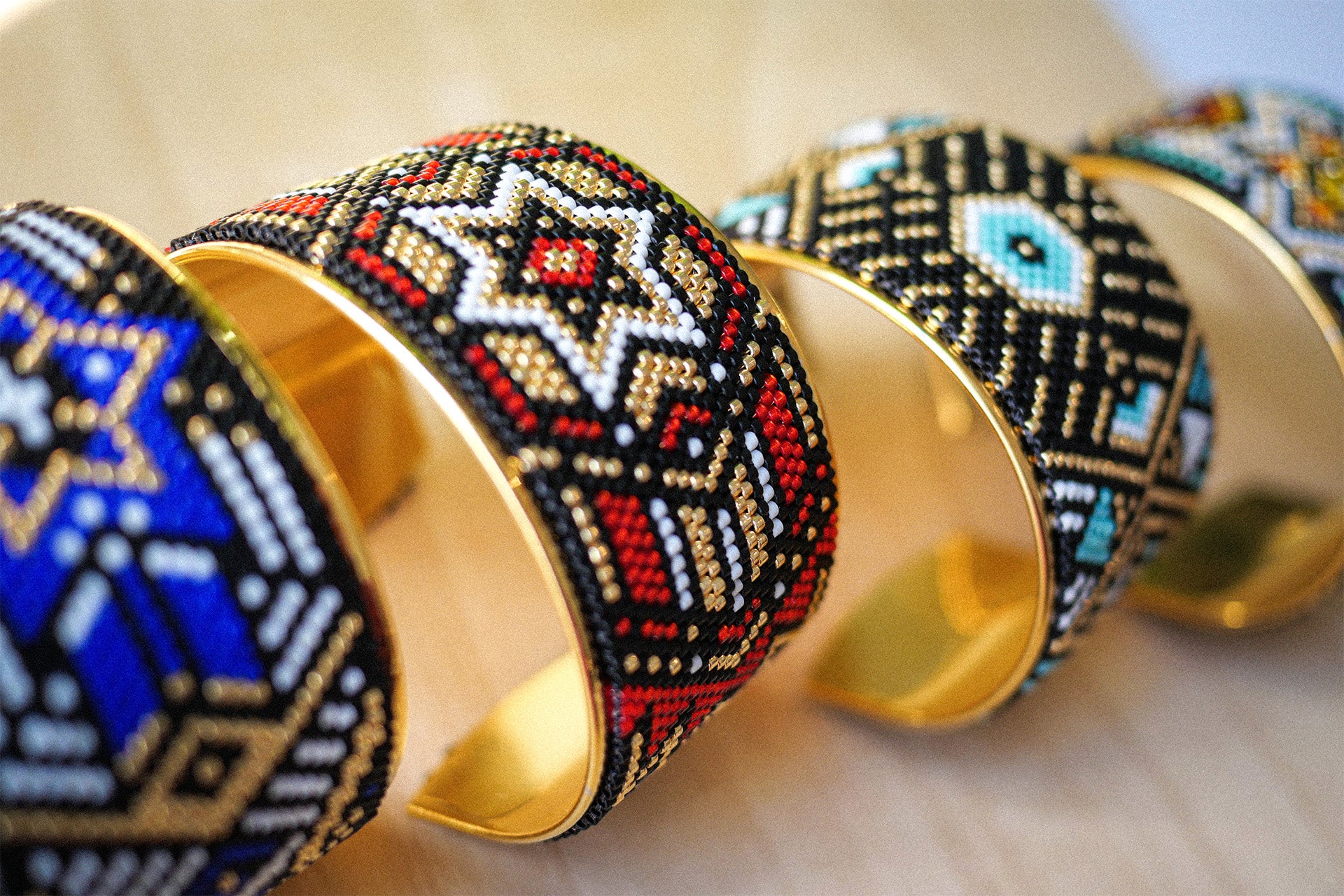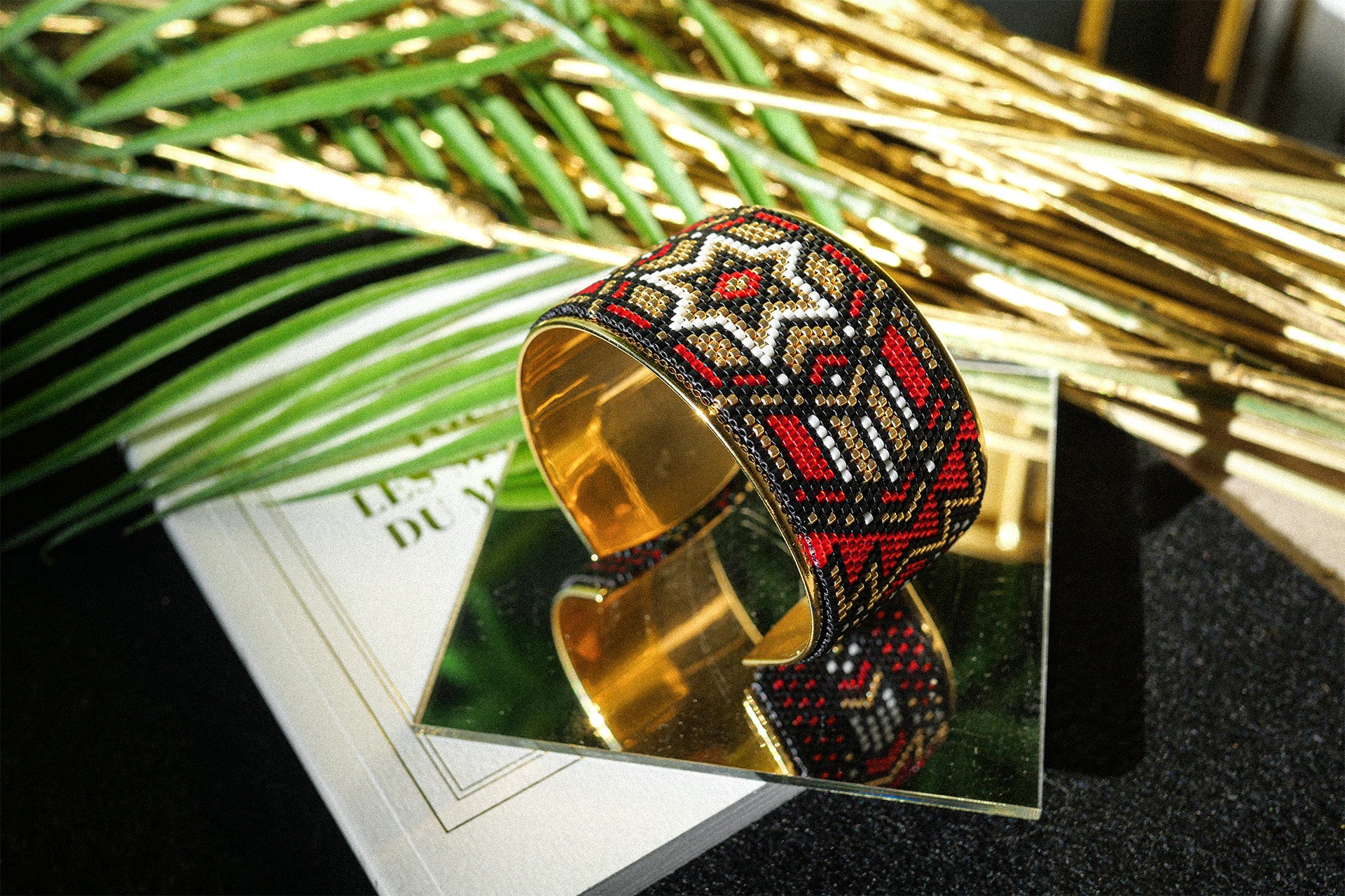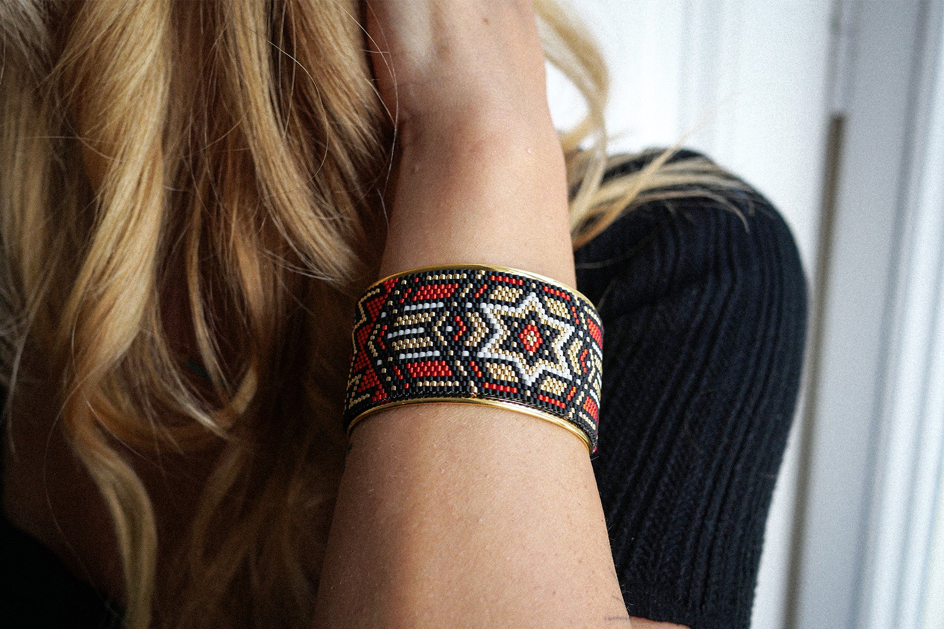 Technique du tissage façon Peyote, qui consiste à enfiler les perles une par une solidement. Cette technique complexe donne un rendu plus résistant, qualitatif et élégant.