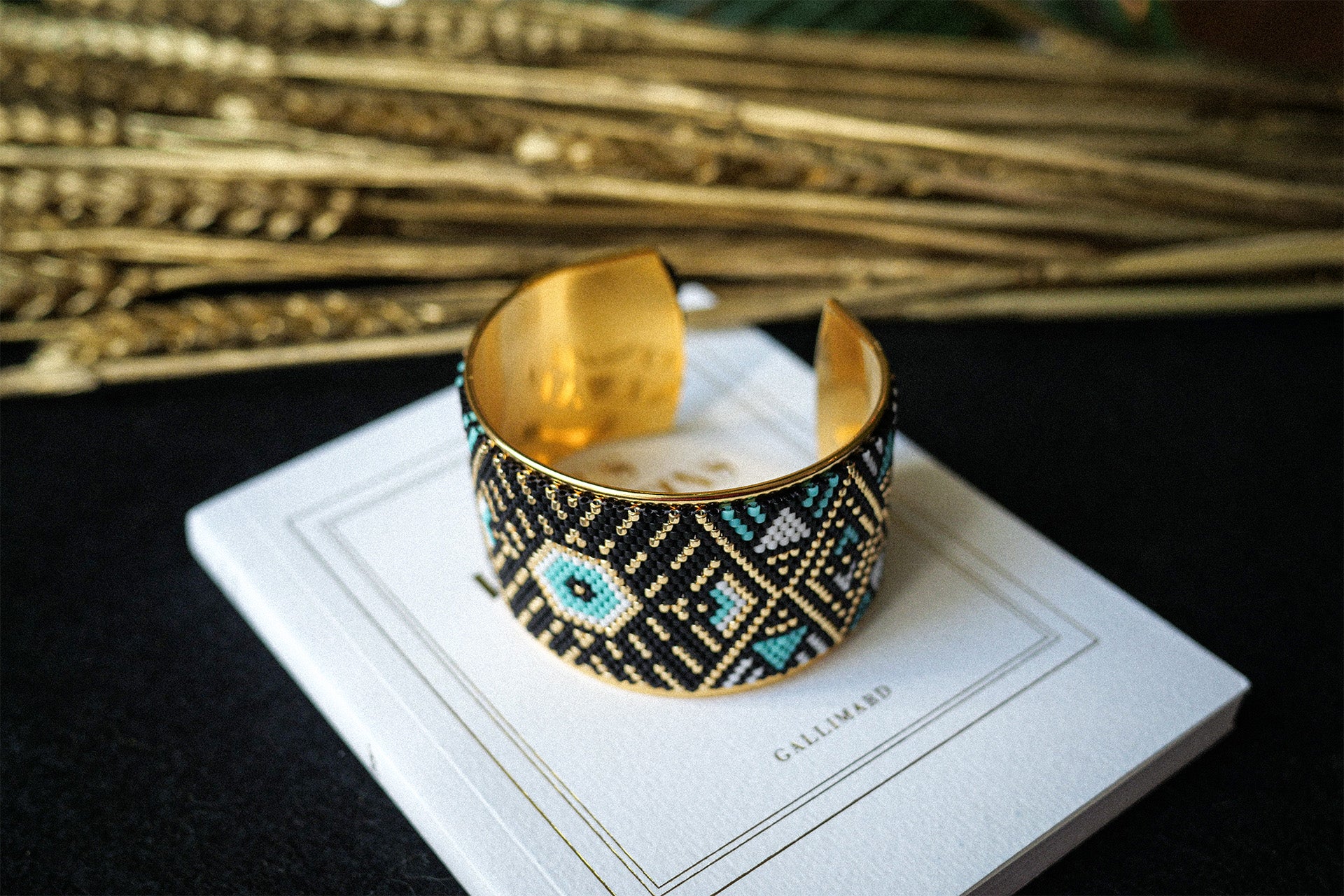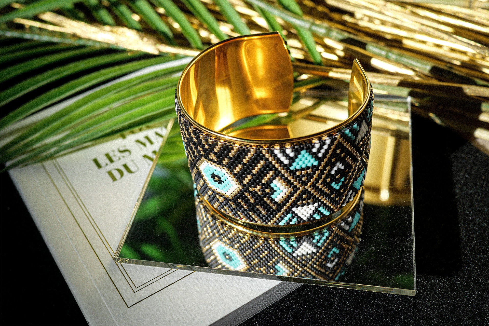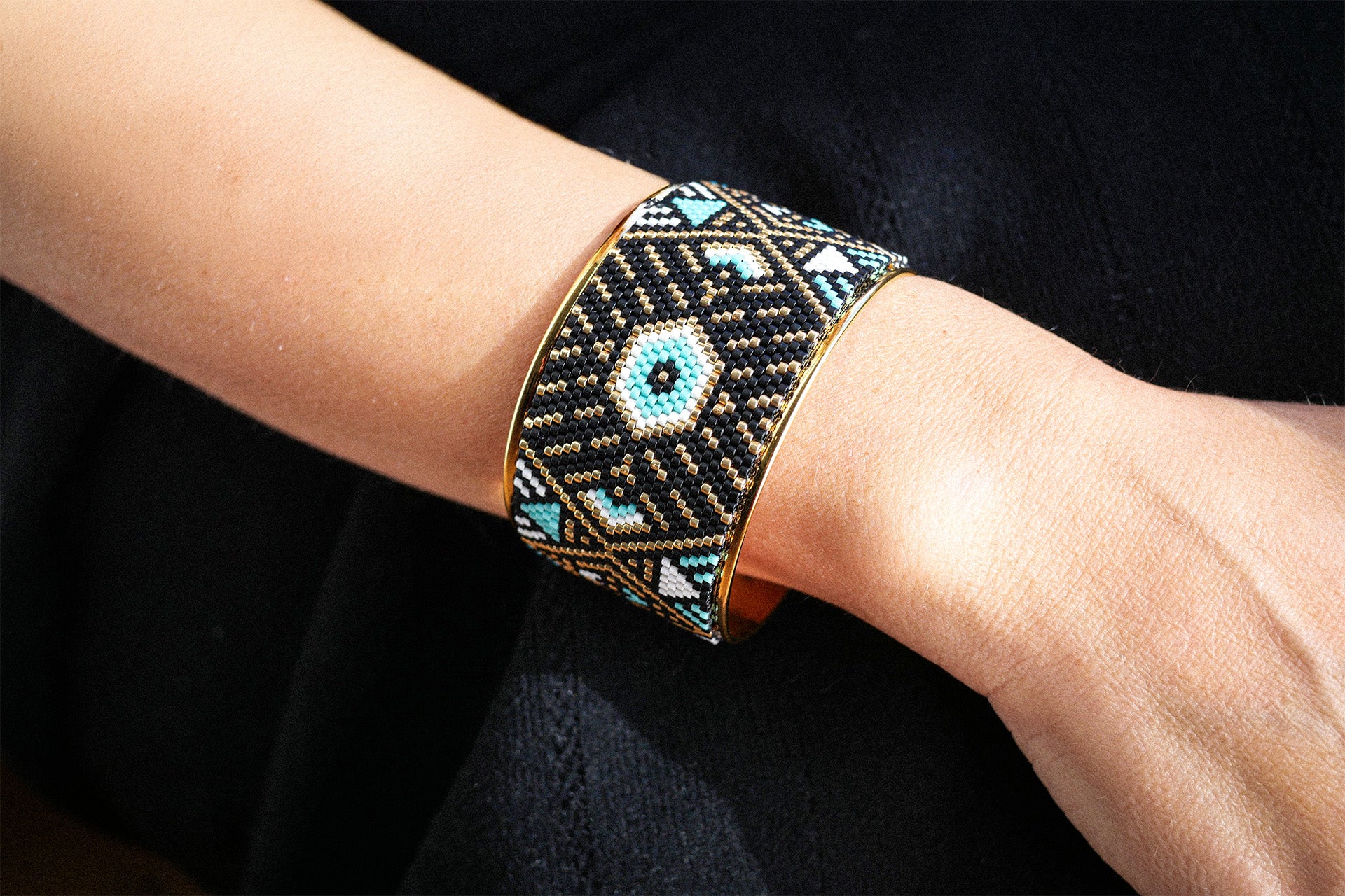 Technique du tissage façon Peyote, qui consiste à enfiler les perles une par une solidement. Cette technique complexe donne un rendu plus résistant, qualitatif et élégant.